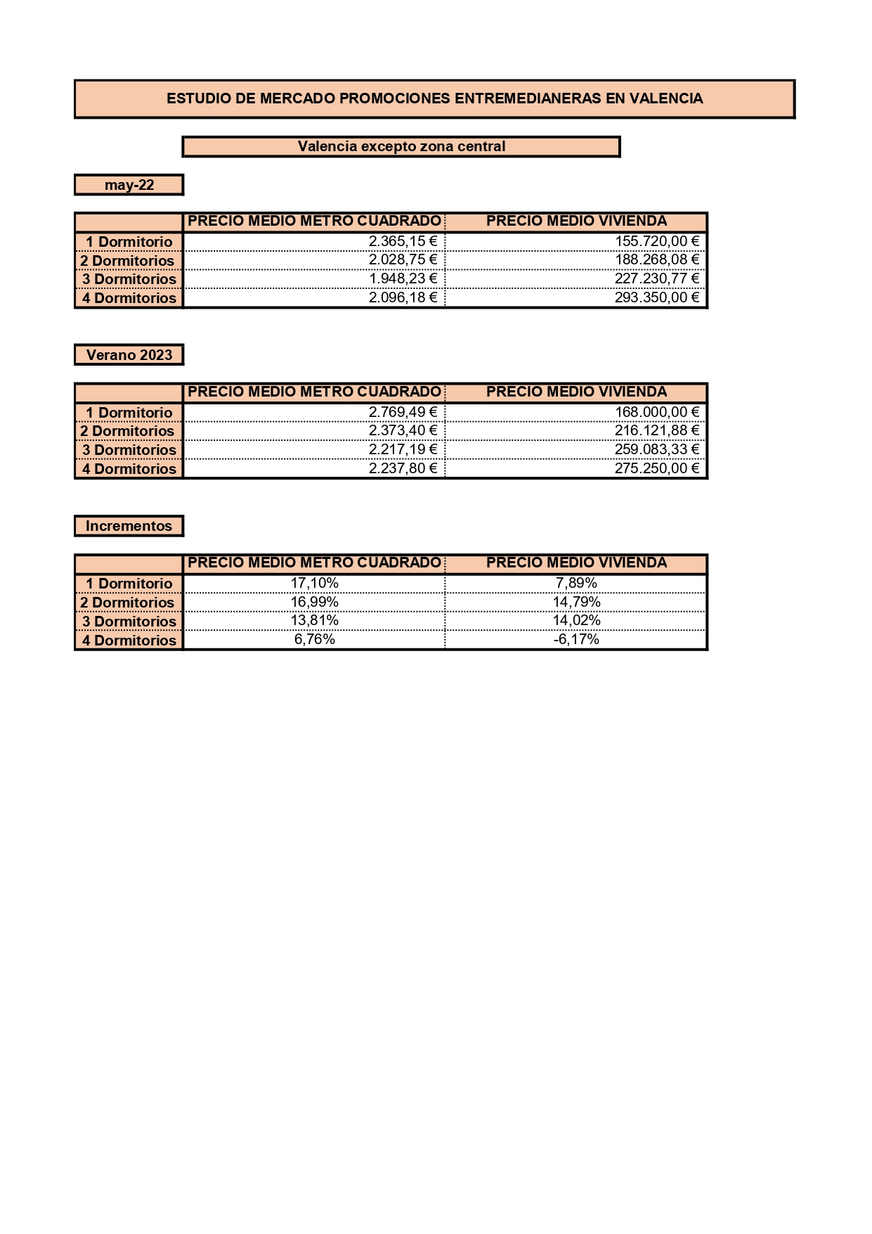 En Grupo Mervi, en la primavera del año pasado realizamos un estudio de mercado de la obra nueva en Valencia capital restringido a las promociones entre medianeras. En fechas recientes, hemos vuelto a realizar el mismo estudio de mercado y os presentamos los resultados en comparación con los del anterior estudio por si pueden ser de interés. La principal conclusión es que los precios han aumentado muy significativamente durante este periodo. Según la tipología tenemos incrementos de precio desde el 7% al 17% lo que a nuestro juicio indica un mercado de la vivienda de obra nueva muy tensionado con una demanda que la oferta existente no es capaz de satisfacer. Hay que tener en cuenta que los datos corresponden a promociones entre medianeras de toda la ciudad de Valencia con excepción de los barrios centrales de la ciudad (Ciutat Vella, L´Eixample y Extramurs). Suelen ser promociones pequeñas y similares a las que hacemos en Grupo Mervi.
