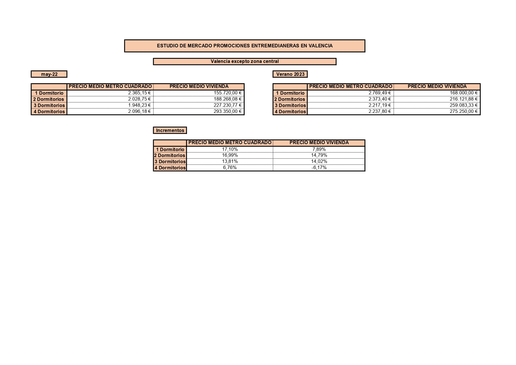 En Grupo Mervi, en la primavera del año pasado realizamos un estudio de mercado de la obra nueva en Valencia capital restringido a las promociones entre medianeras. En fechas recientes, hemos vuelto a realizar el mismo estudio de mercado y os presentamos los resultados en comparación con los del anterior estudio por si pueden ser de interés. La principal conclusión es que los precios han aumentado muy significativamente durante este periodo. Según la tipología tenemos incrementos de precio desde el 7% al 17% lo que a nuestro juicio indica un mercado de la vivienda de obra nueva muy tensionado con una demanda que la oferta existente no es capaz de satisfacer. Hay que tener en cuenta que los datos corresponden a promociones entre medianeras de toda la ciudad de Valencia con excepción de los barrios centrales de la ciudad (Ciutat Vella, L´Eixample y Extramurs). Suelen ser promociones pequeñas y similares a las que hacemos en Grupo Mervi.